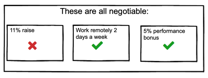 First, notice how you’re asking for three things rather than one. This really opens up the negotiating table because your employer can choose 1–3 items to counter on. And the best is, each of those items are negotiable as well. This approach opens you up to lots of opportunities, opportunities you may not have realized was possible until you ask. For example, some companies are very open to remote work; others aren’t. So it pays to ask. (We’ll cover the different types of things you can ask for in just a moment.)