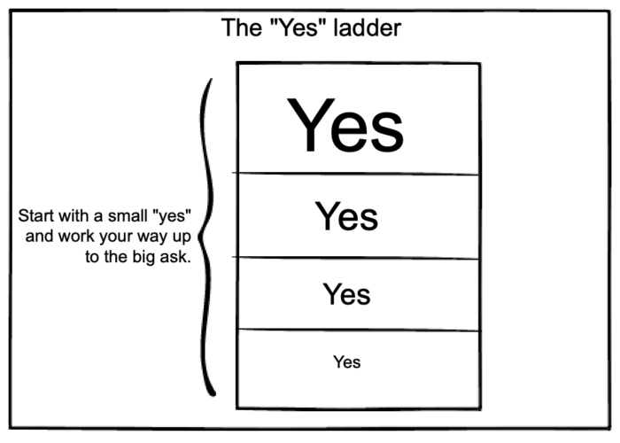 The “Yes ladder.” Get a small yes first, then keep asking for bigger and better.