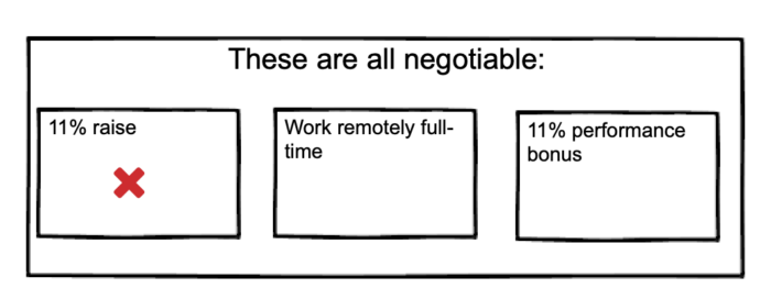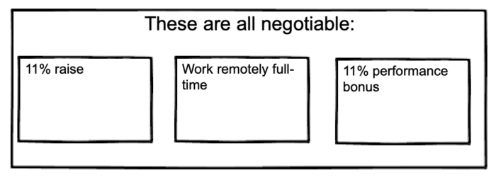 Say the following: “Going forward, I’d like three things: a 11% pay increase, the ability to work from home full-time, and a performance bonus if I also achieve X, Y, and Z.”