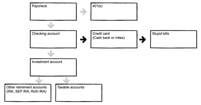 Key point: by setting up your accounts like the above, you are “paying yourself first.” It’s FAR more effective to invest first and live of the remainder, than to spend first and invest the rest. This key point is worth six or seven figures in wealth over a lifetime.