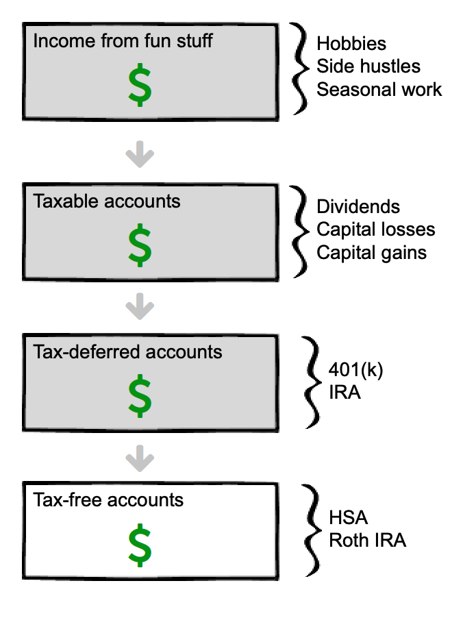 Your tax-free accounts should only be touched last. Since you’ll never pay taxes on these accounts—unlike all other accounts on this list—it makes sense to let these grow for as long as possible.