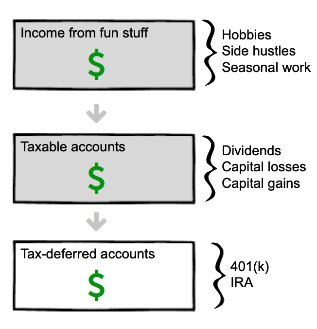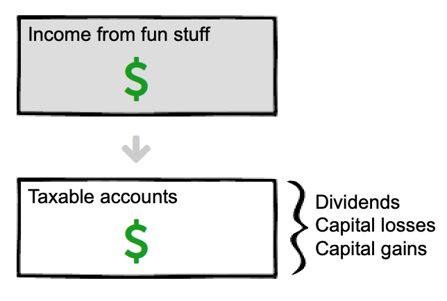 So you aren’t making money from a job—which turns out to be a good thing because when your income goes down, you will likely enter a lower tax bracket. In other words, when you live off your bank instead of your back you pay less tax. Which is nice.